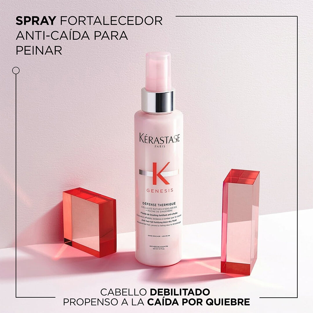 Protector térmico fortificante del secado con calor para cabellos debilitados y propensos a la caída del cabello por el quebrantamiento producido por el cepillado.