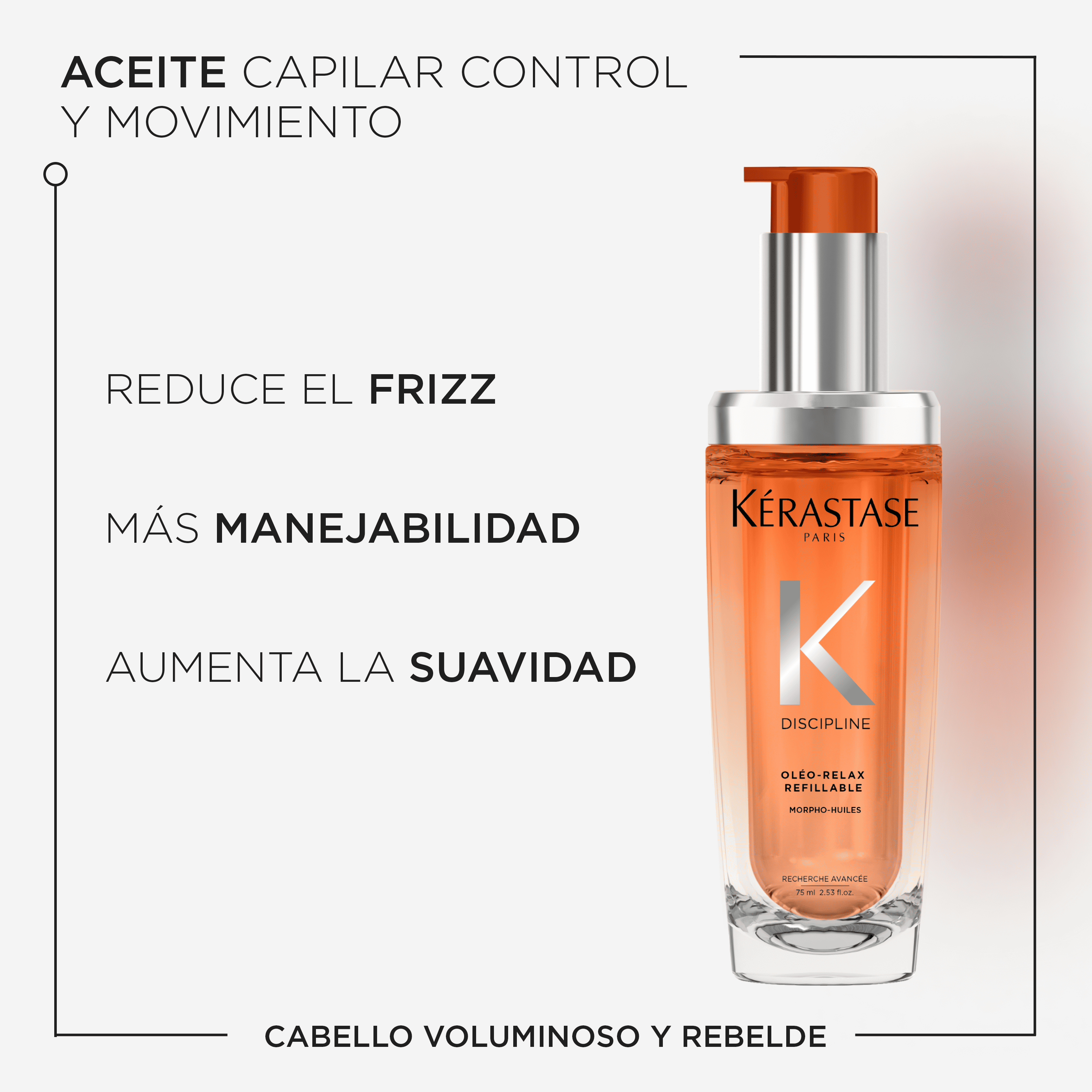 L'Huile Oléo-Relax recargable es un aceite para cabello voluminoso y rebelde. Unas gotas bastan para reducir el frizz y conseguir un cabello más manejable y suave.